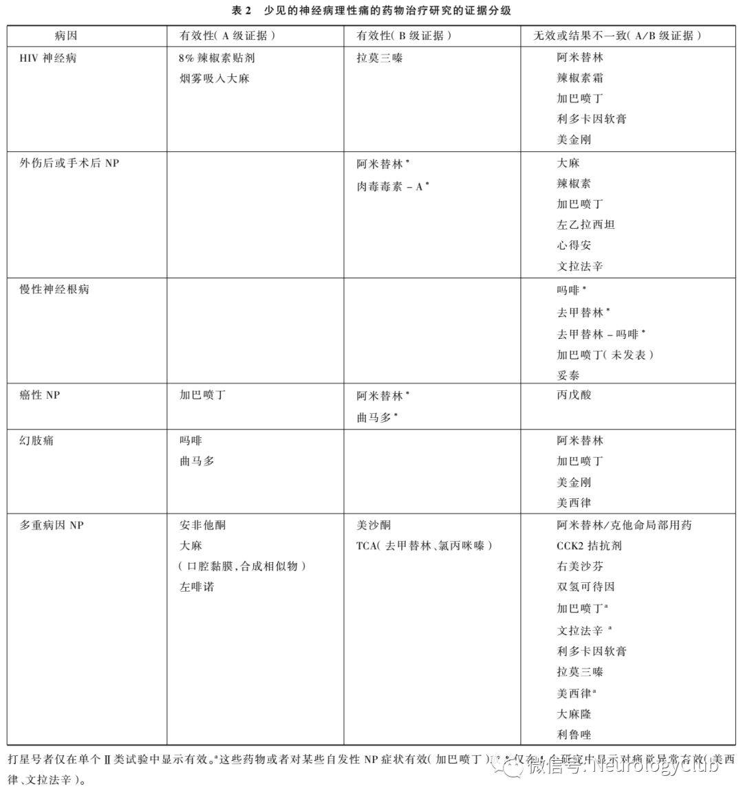 癌性NP:A级证据证实加巴喷丁有效(1个研究),B级证据证明TCA和曲马多有效,丙戊酸钠无效。外伤性NP:1项多大型试验显示加巴喷丁对主要结局无效,但改善了数个次要结局;虽然有效反应的预测因素尚有待确定,但加巴喷丁可能对某些亚组患者有益(A级证据)。B级证据证实抗抑郁剂的疗效,有报道肉毒毒素-A有较,其他药物却无效或不一致结果。神经根病:加巴喷丁(A级证据)、TCA和阿片类以及两者的复合制剂(B级证据)无效或仅有轻微疗效。幻肢痛:曲马多和吗啡有效(A级证据),加巴喷丁的疗效不一致。多重病因NP:有效药物是抗抑郁剂(安非他酮、TCA)、阿片类(左啡诺、美沙酮)和大麻。