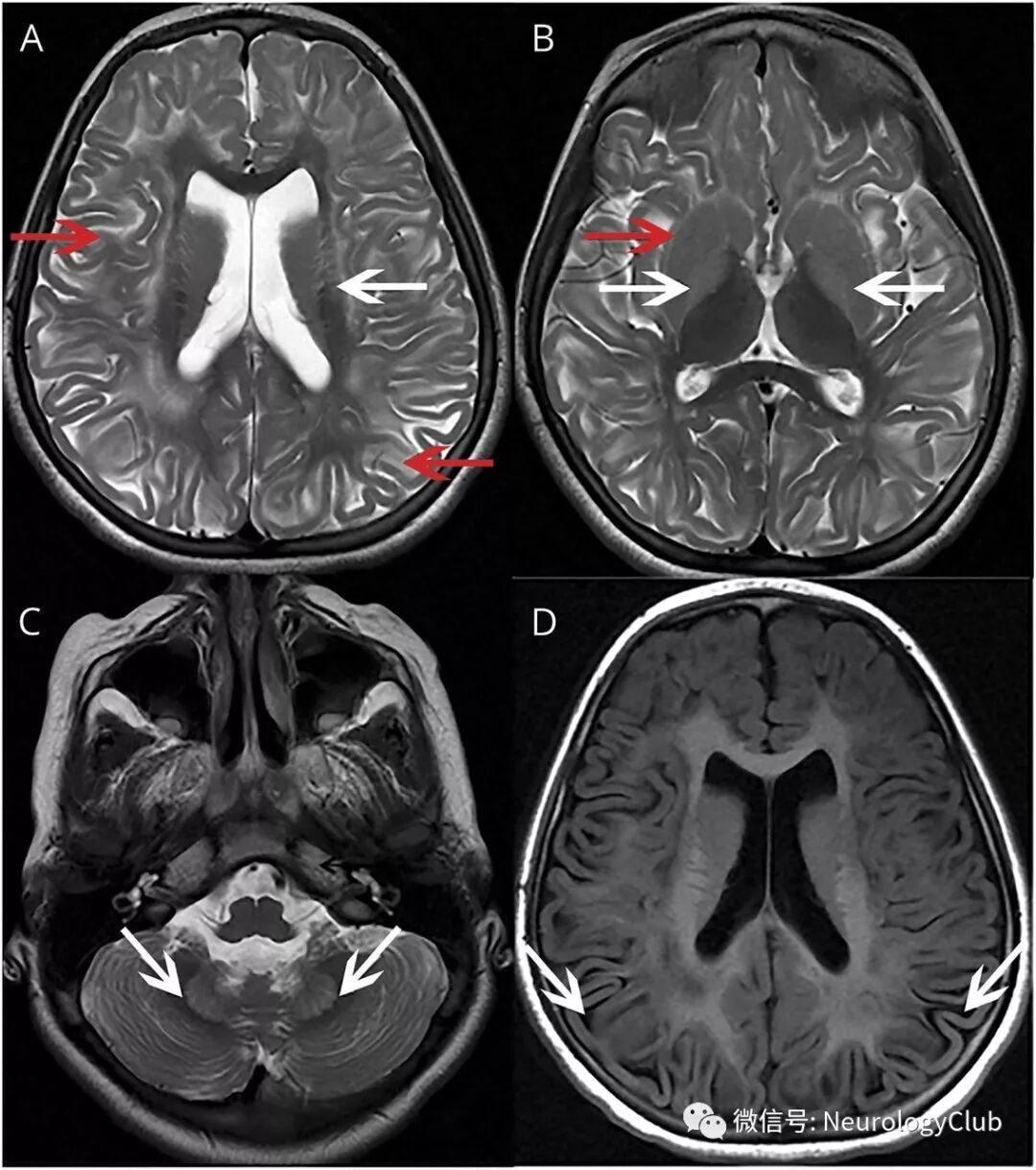 (图:A:T2WI可见双侧对称性白质(WM)高信号[红箭],呈向心型分布,累及皮质下和深部WM,脑室周围WM不受累[白箭];B:基底节高信号[白箭]伴壳核边缘更高信号[外缘征outer rim sign,红箭];C:齿状核高信号[白箭];D:FLAIR可见脑组织稀疏[白箭])