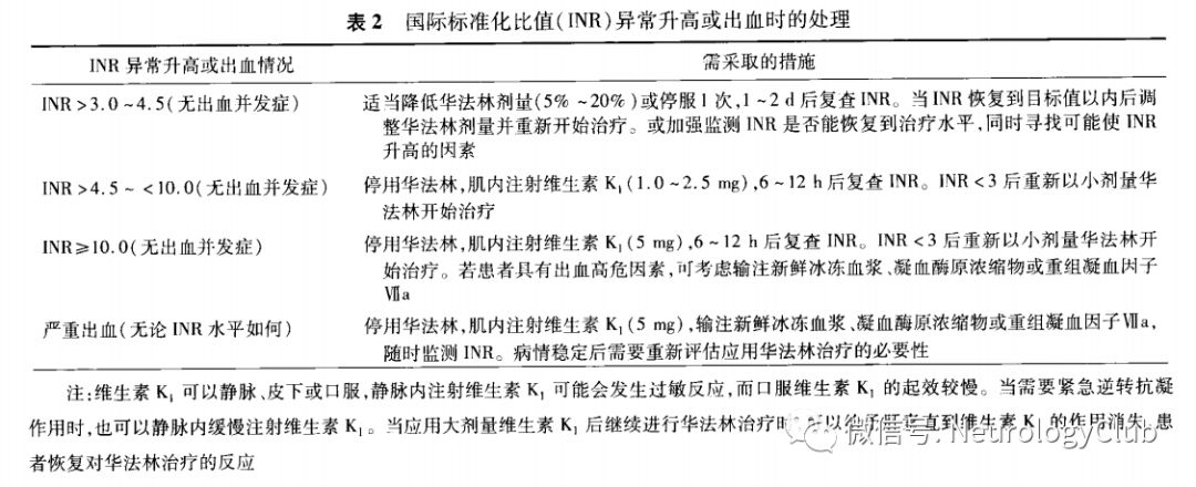 5. INR异常和(或)出血时的处理:INR升高超过治疗范围,根据升高程度及患者出血危险采取不同的方法(表2)。服用华法林出现轻微出血而INR在目标范围内时,不必立即停药或减量,应寻找原因并加强监测。患者若出现与华法林相关的严重出血,首先应该立即停药,输凝血酶原复合物迅速逆转抗凝,还需要静脉注射维生素K1 5-10mg。