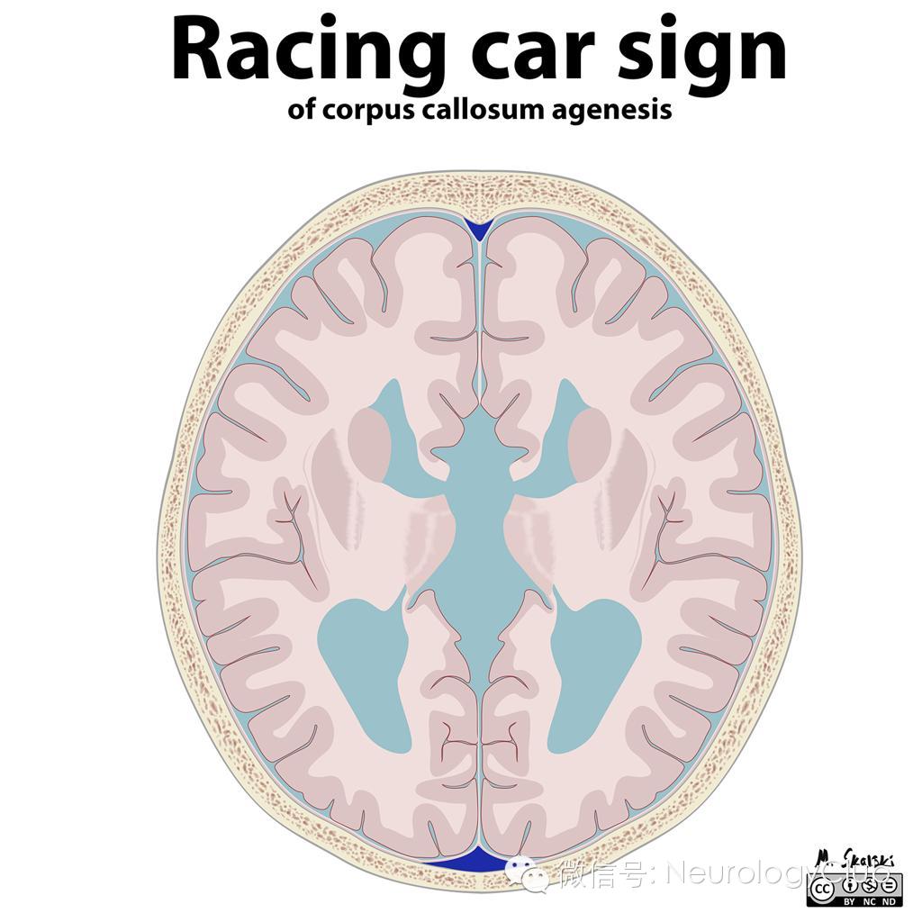 赛车征为胼胝体发育不良(Dysgenesis/Agenesis of the corpus callosum)的典型表现。胼胝体发育不良是胚胎期背部中线结构发育不良所致的胼胝体部分或全部及其周围结构缺如,是最常见的颅脑畸形之一。1899年由Bruce首先描述,1912年由Reil首先报道1例尸检患者,可伴发其他中枢神经系统畸形,也可合并脂肪瘤。一般认为,胼胝体形成顺序为膝部,体部,压部和嘴部,形成越迟的部分发育缺如越常见。